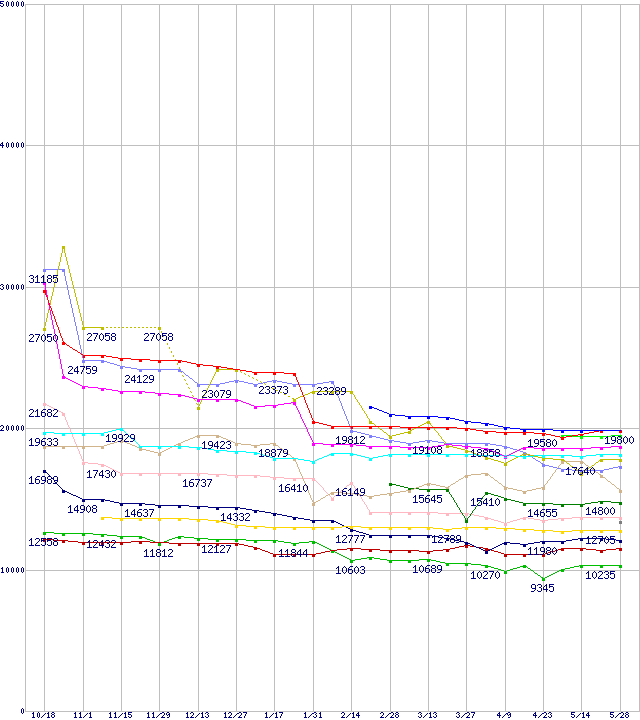 | [↑前グラフ]: | CPU主要製品(最安値1万円未満)の最安値推移 |