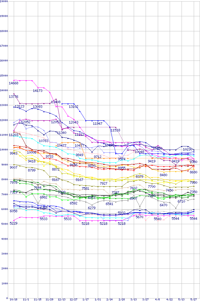 HDD主要製品(最安値1万円~1万5千円未満)の最安値推移