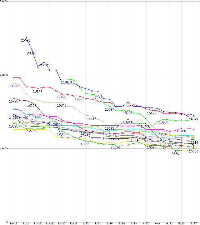 | [↓次グラフ]: | HDD主要製品(最安値1万5千円~2万円未満)の最安値推移 |