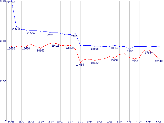 | [↑前グラフ]: | Socket 478 (micro-PGA,FSB 533MHz,L2 1MB,Prescott)の最安値推移 |