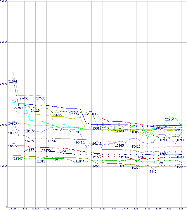 | [↑前グラフ]: | CPU主要製品(最安値1万円未満)の最安値推移 |