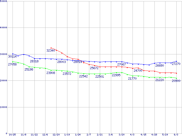| [↑前グラフ]: | HDD主要製品(最安値1万5千円~2万円未満)の最安値推移 |