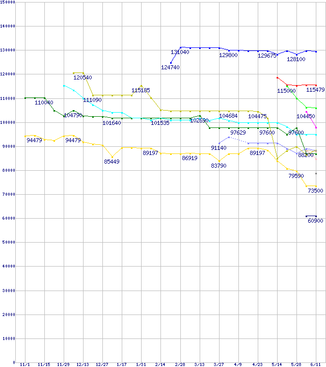 | [↑前グラフ]: | CPU主要製品(最安値3万円~6万円未満)の最安値推移 |
