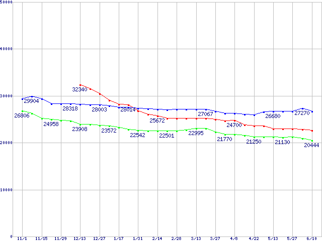 | [↑前グラフ]: | HDD主要製品(最安値1万5千円~2万円未満)の最安値推移 |