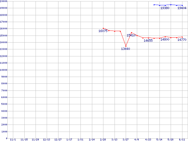 | [↑前グラフ]: | Socket 478 (micro-PGA,FSB 533MHz,L2 512KB,Hyper-Threading,Northwood)の最安値推移 |
