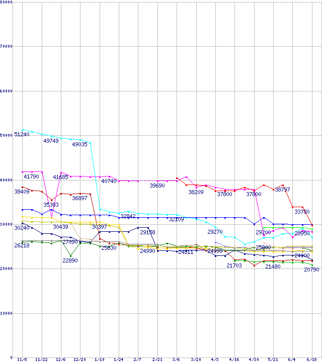 | [↑前グラフ]: | CPU主要製品(最安値1万円~2万円未満)の最安値推移 |