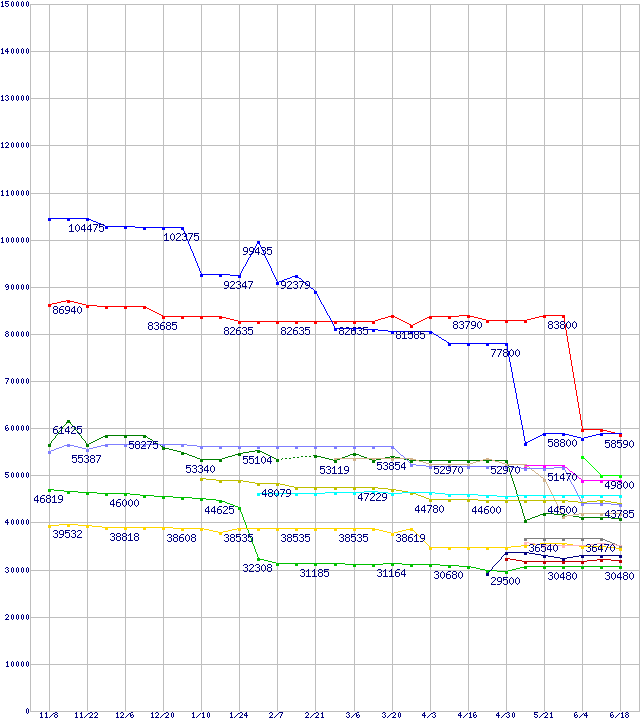 | [↓次グラフ]: | CPU主要製品(最安値6万円以上)の最安値推移 |