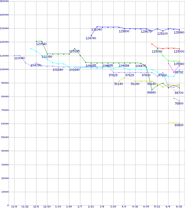 | [↑前グラフ]: | CPU主要製品(最安値3万円~6万円未満)の最安値推移 |
