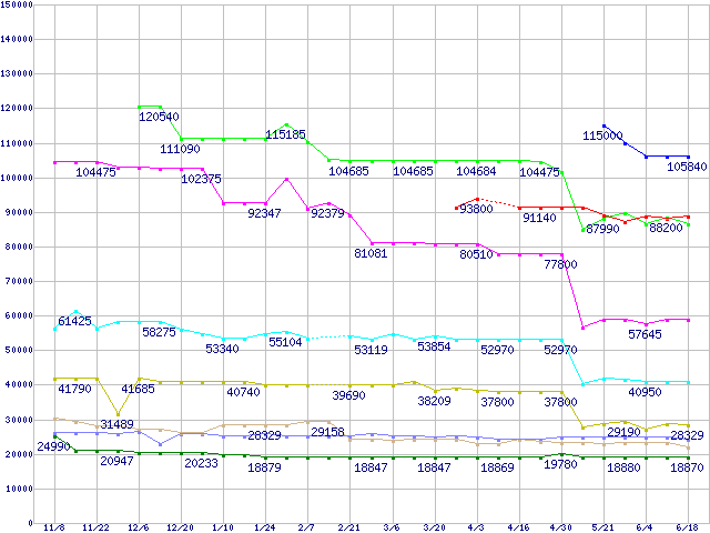 | [↑前グラフ]: | CPU主要製品(最安値6万円以上)の最安値推移 |