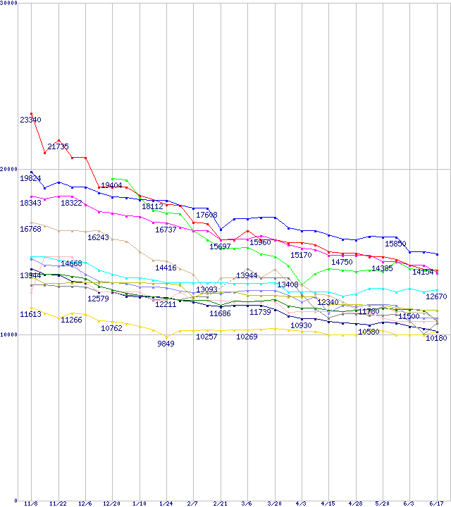 | [↓次グラフ]: | HDD主要製品(最安値1万5千円~2万円未満)の最安値推移 |