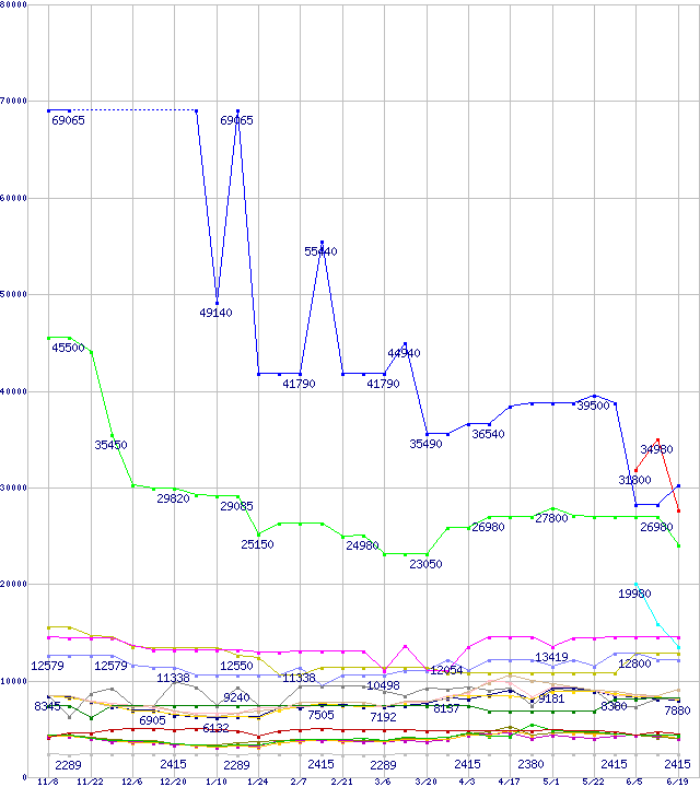 メモリ主要製品(最安値1万円以上)の最安値推移