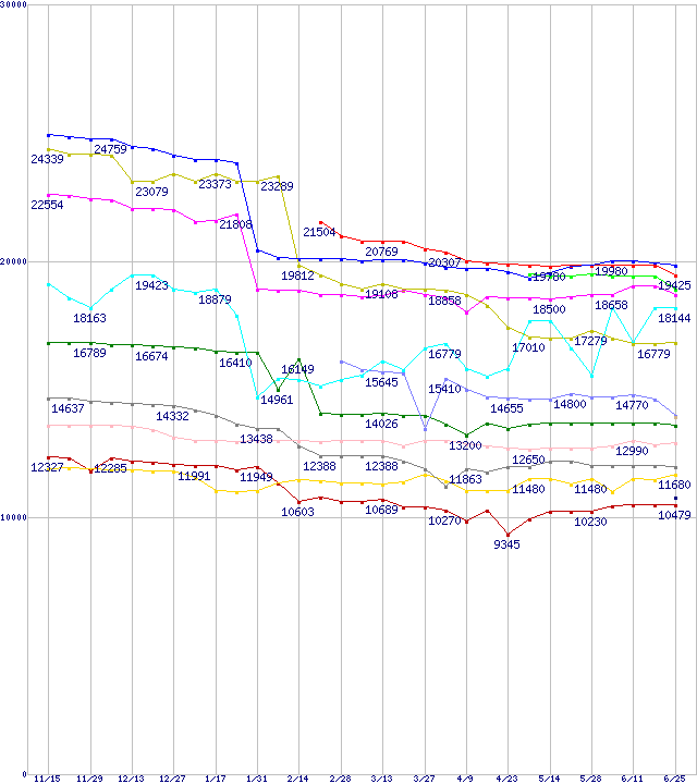 | [↑前グラフ]: | CPU主要製品(最安値1万円未満)の最安値推移 |