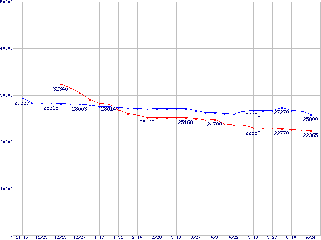 | [↑前グラフ]: | HDD主要製品(最安値1万5千円~2万円未満)の最安値推移 |
