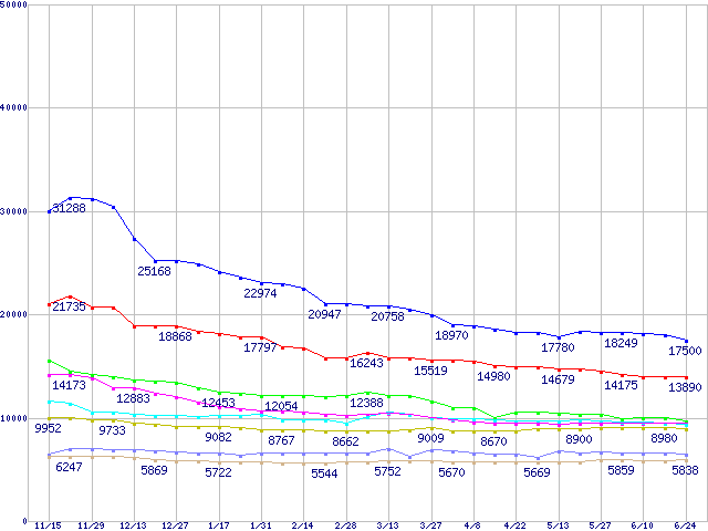 | [↑前グラフ]: | Deskstar 7K250 (7200rpm,SerialATA/150,FDB)の最安値推移 |
