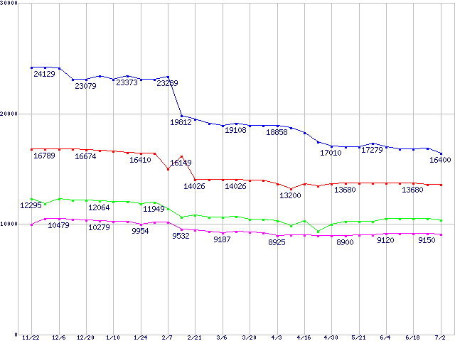| [↑前グラフ]: | Socket A (OPGA,FSB 400MHz,L2 512KB,Barton)の最安値推移 |