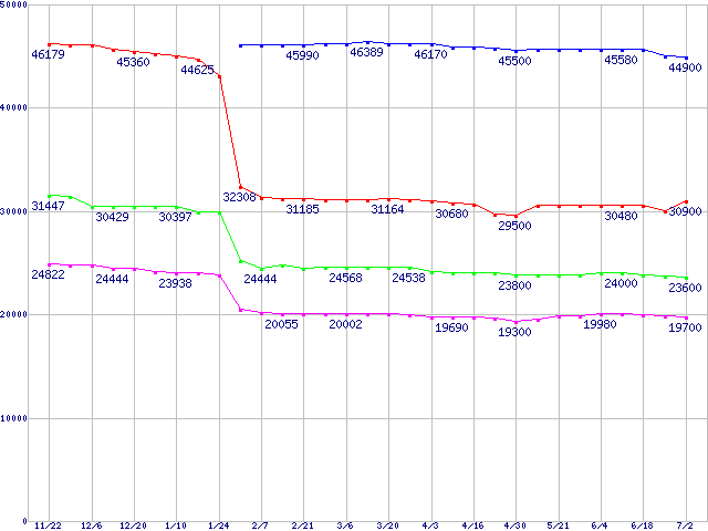 | [↑前グラフ]: | Socket 478 (FC-PGA2,FSB 800MHz,L2 1MB,Hyper-Threading,Prescott)の最安値推移 |