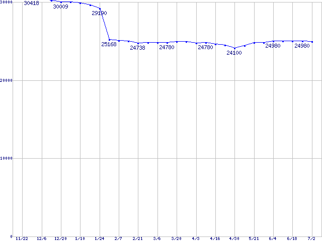 | [↑前グラフ]: | Socket 478 (FC-PGA2,FSB 800MHz,L2 512KB,Hyper-Threading,Northwood)の最安値推移 |