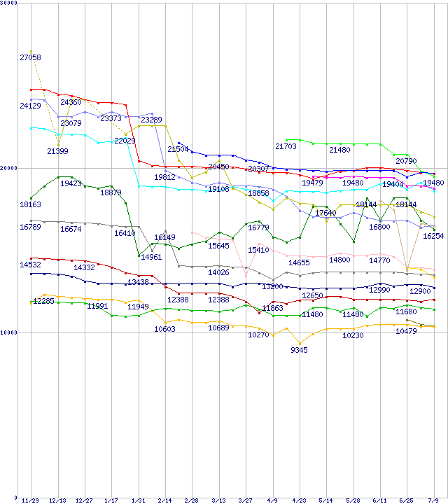 | [↓次グラフ]: | CPU主要製品(最安値2万円~3万円未満)の最安値推移 |