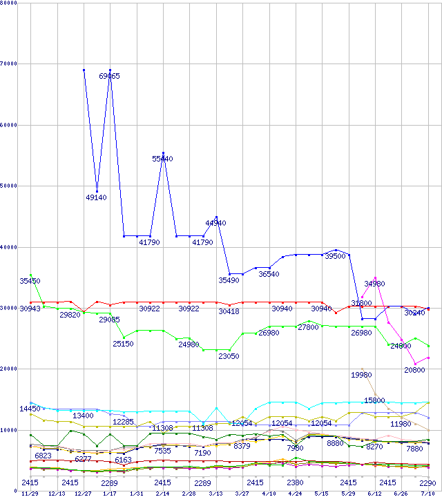 メモリ主要製品(最安値1万円以上)の最安値推移