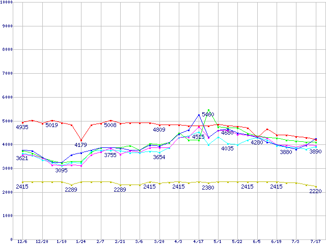 | [↓次グラフ]: | メモリ主要製品(最安値5千円~1万円未満)の最安値推移 |