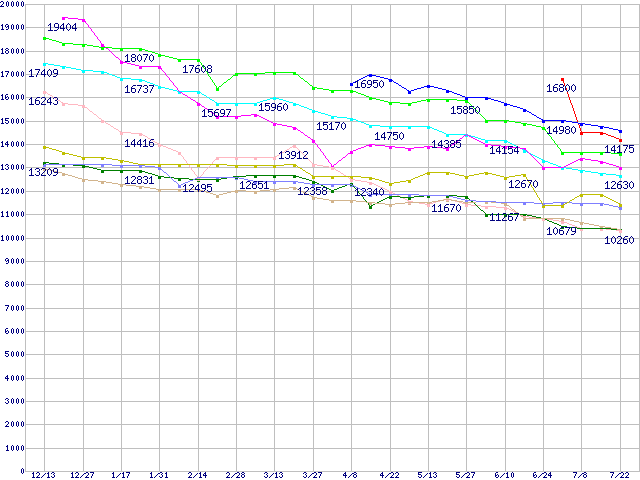 | [↓次グラフ]: | HDD主要製品(最安値1万5千円~2万円未満)の最安値推移 |
