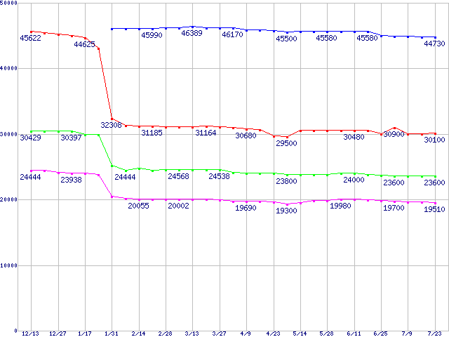 | [↑前グラフ]: | Socket 478 (FC-PGA2,FSB 800MHz,L2 1MB,Hyper-Threading,Prescott)の最安値推移 |