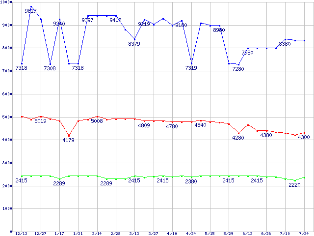 | [↑前グラフ]: | PC2 3200(DDR2 400) DDR2 SDRAM DIMM ECC対応 Registeredタイプの最安値推移 |