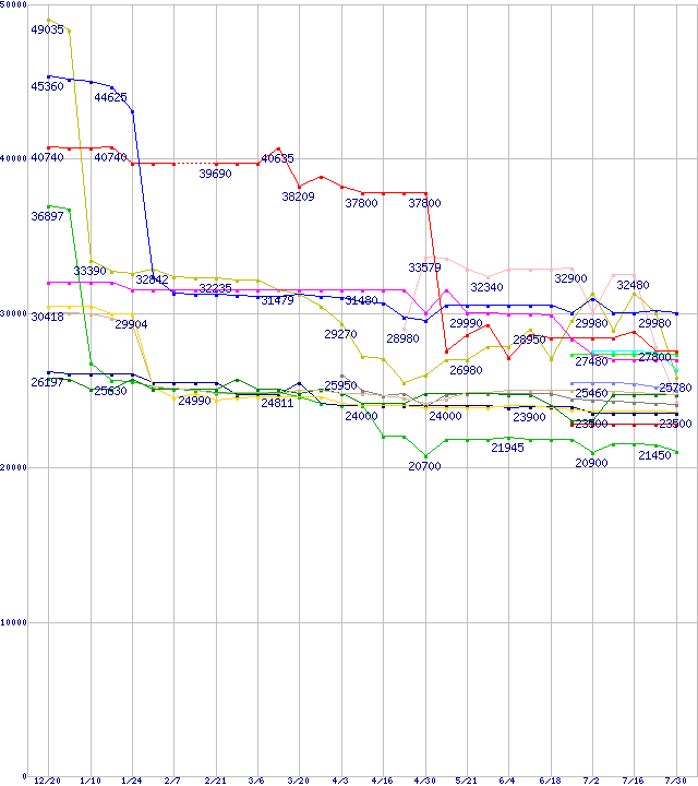 | [↑前グラフ]: | CPU主要製品(最安値1万円~2万円未満)の最安値推移 |