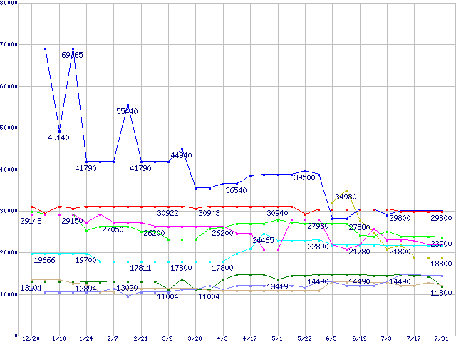 メモリ主要製品(最安値1万円以上)の最安値推移