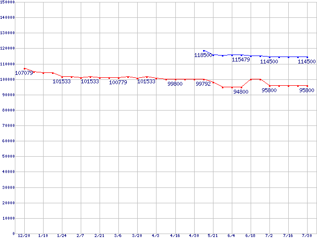 | [↑前グラフ]: | LGA 775 (FC-LGA4 ,FSB 800MHz,L2 1MB,Hyper-Threading,Prescott)の最安値推移 |