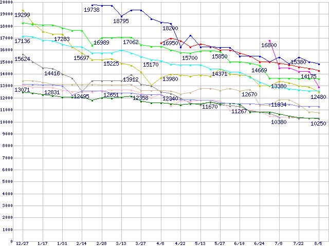 | [↓次グラフ]: | HDD主要製品(最安値1万5千円~2万円未満)の最安値推移 |