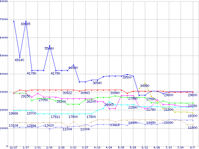 | [↑前グラフ]: | メモリ主要製品(最安値5千円~1万円未満)の最安値推移 |