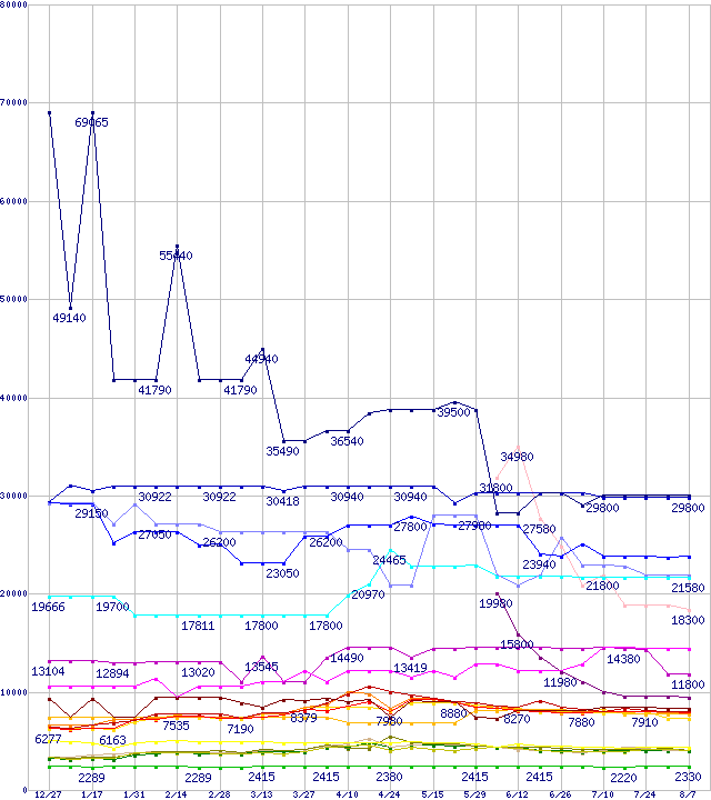 メモリ主要製品(最安値1万円以上)の最安値推移