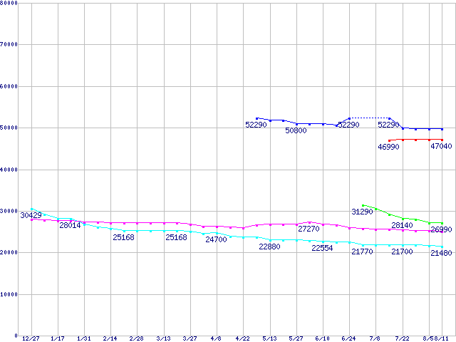 | [↑前グラフ]: | HDD主要製品(最安値1万5千円~2万円未満)の最安値推移 |