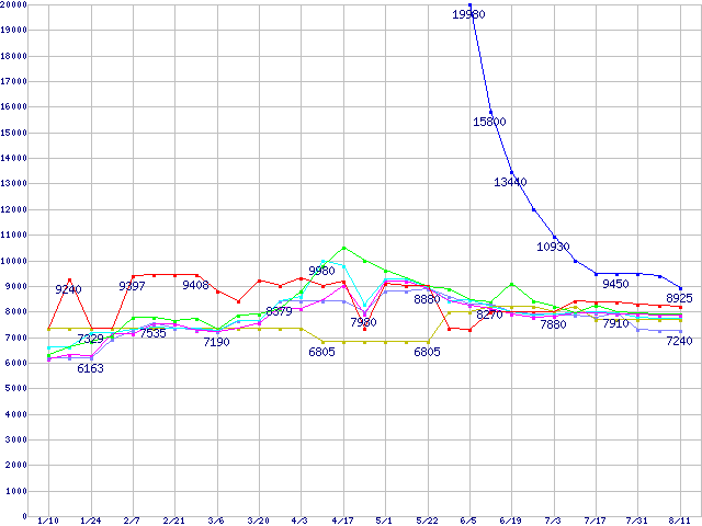 | [↑前グラフ]: | メモリ主要製品(最安値5千円未満)の最安値推移 |