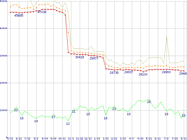 Socket 478 (FC-PGA2,FSB 533MHz,L2 512KB,Hyper-Threading,Northwood)の最安値推移