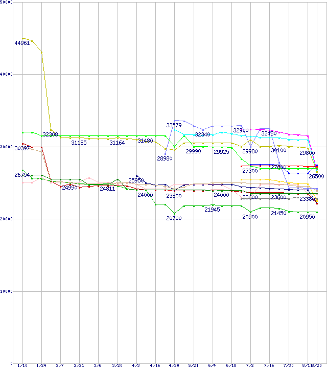 | [↑前グラフ]: | CPU主要製品(最安値1万円~2万円未満)の最安値推移 |