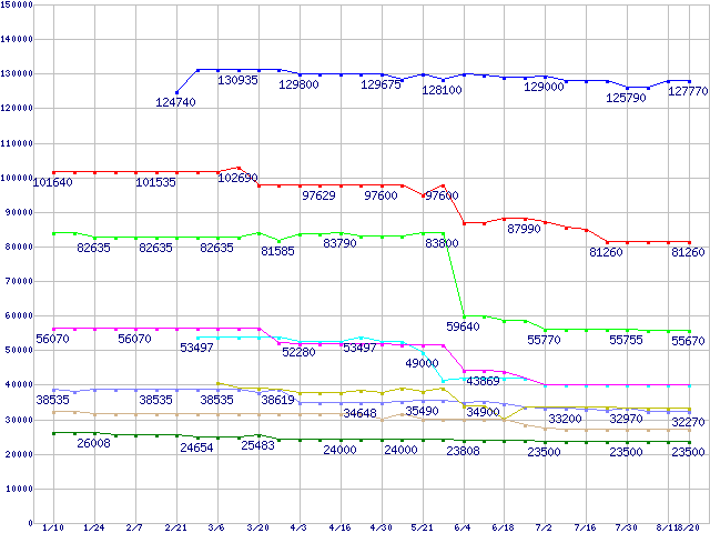 | [↑前グラフ]: | Socket 604 (FCBGA,FSB 800MHz,L2 1MB,Nocona)の最安値推移 |
