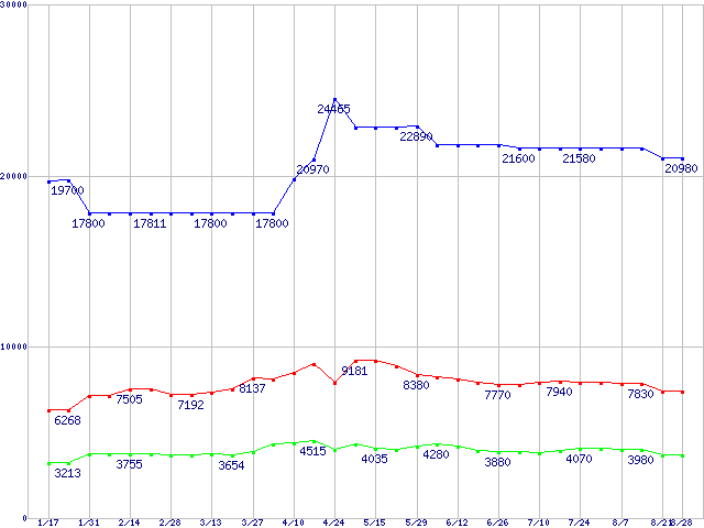 | [↑前グラフ]: | PC2700(DDR333) DDR SDRAM DIMM ECC対応 Registeredタイプの最安値推移 |