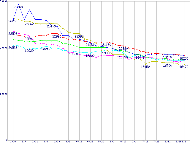 | [↓次グラフ]: | HDD主要製品(最安値2万円以上)の最安値推移 |