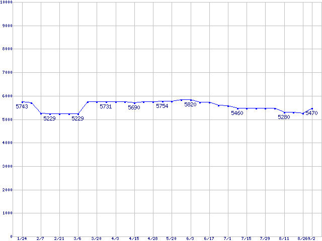| [↑前グラフ]: | DiamondMax 16 (5400rpm,UltraATA/133,2MB,80GB/Platter,FDB)の最安値推移 |