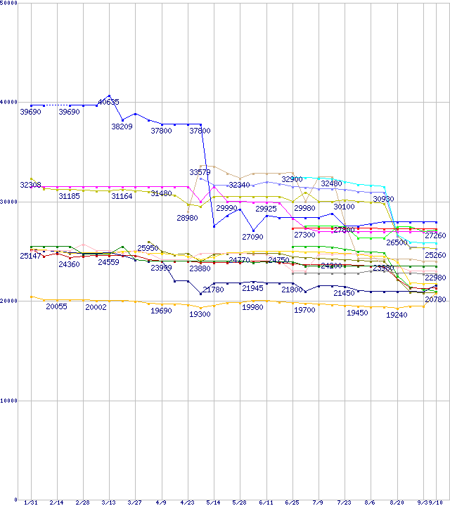 | [↑前グラフ]: | CPU主要製品(最安値1万円~2万円未満)の最安値推移 |