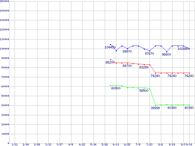 | [↑前グラフ]: | CPU主要製品(最安値6万円以上)の最安値推移 |
