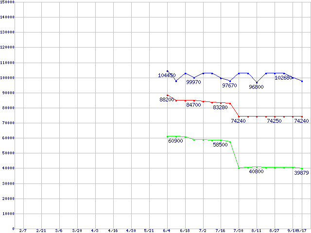 | [↑前グラフ]: | CPU主要製品(最安値6万円以上)の最安値推移 |