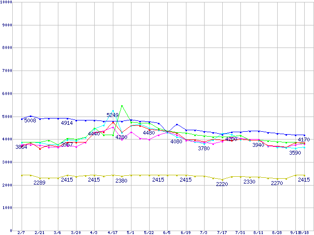 | [↓次グラフ]: | メモリ主要製品(最安値5千円~1万円未満)の最安値推移 |