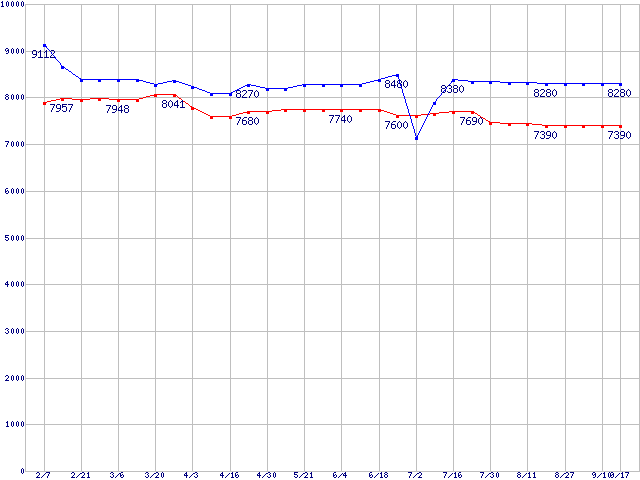| [↑前グラフ]: | Socket A (OPGA,FSB 333MHz,L2 256KB,Thoroughbred)の最安値推移 |