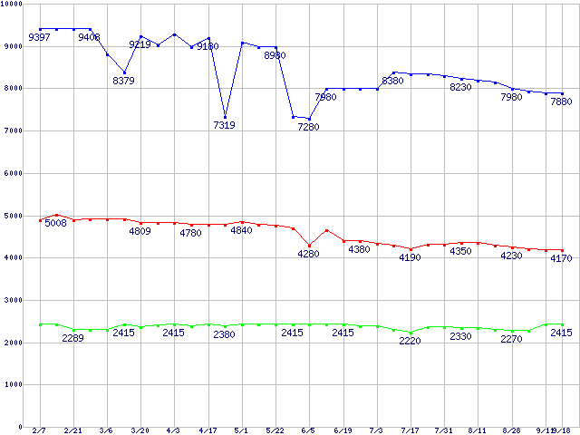 | [↑前グラフ]: | PC2 3200(DDR2 400) DDR2 SDRAM DIMM ECC対応 Registeredタイプの最安値推移 |