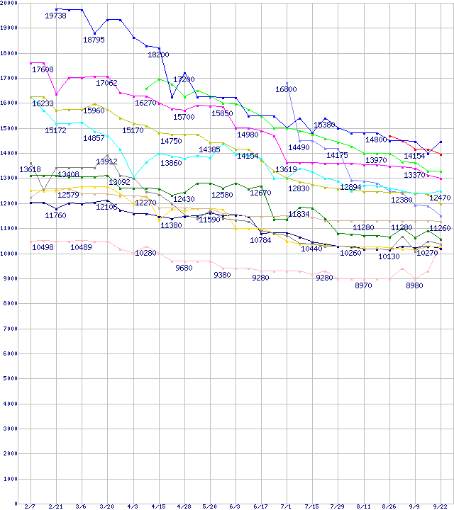 | [↓次グラフ]: | HDD主要製品(最安値1万5千円~2万円未満)の最安値推移 |
