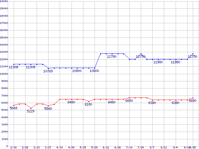 | [↑前グラフ]: | PC3200(DDR400) DDR SDRAM DIMM ECC対応 Registeredタイプの最安値推移 |