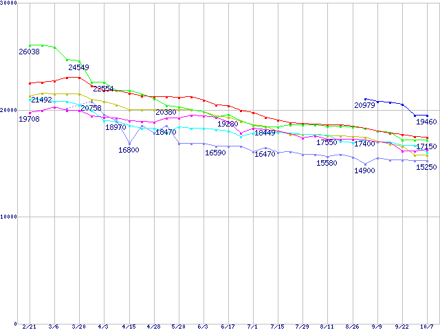 | [↓次グラフ]: | HDD主要製品(最安値2万円以上)の最安値推移 |